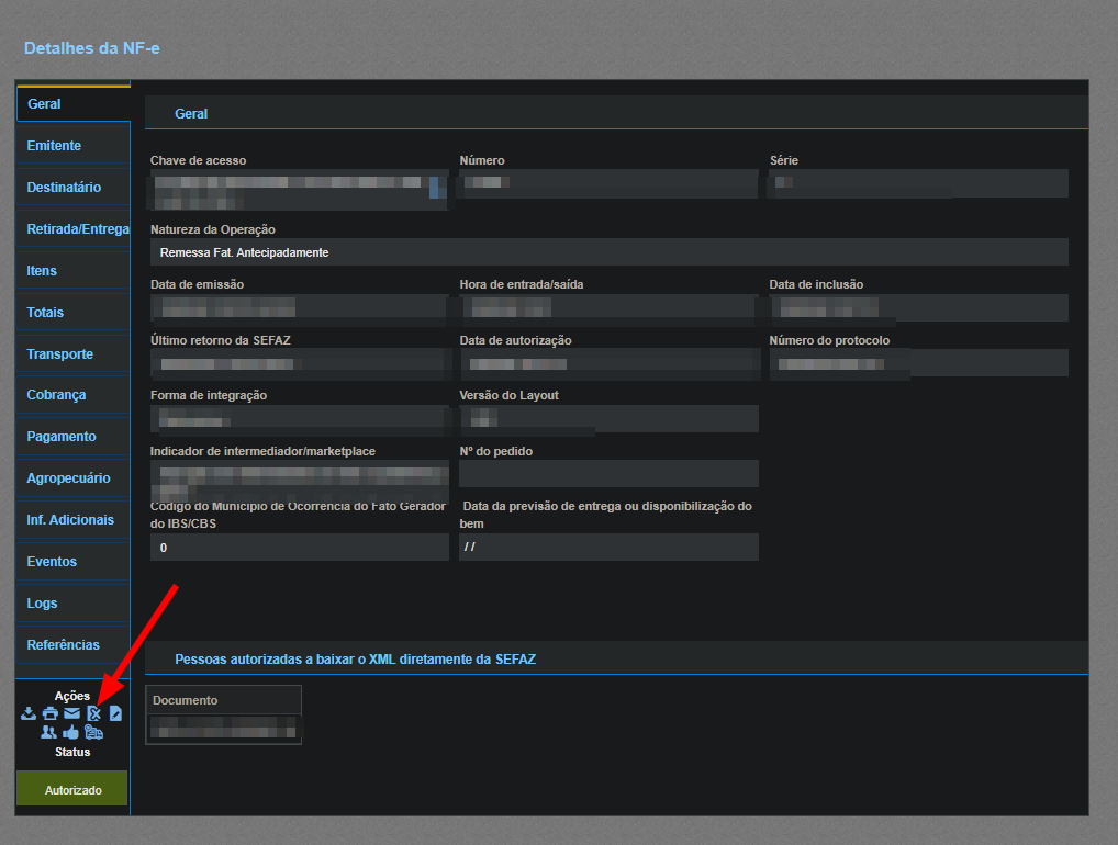 Dica bônus: Caso queria conferir a nota basta clicar onde está escrito "AUTORIZADO" que acessará os dados da nota e também lhe dá mais uma opção de Cancelar a nota.