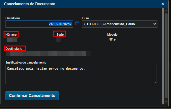 3- Ao Clicar em Cancelamento verifique na tela abaixo que aparecerá pra você, se está na nota correta ( Número, Série e Destinatário):